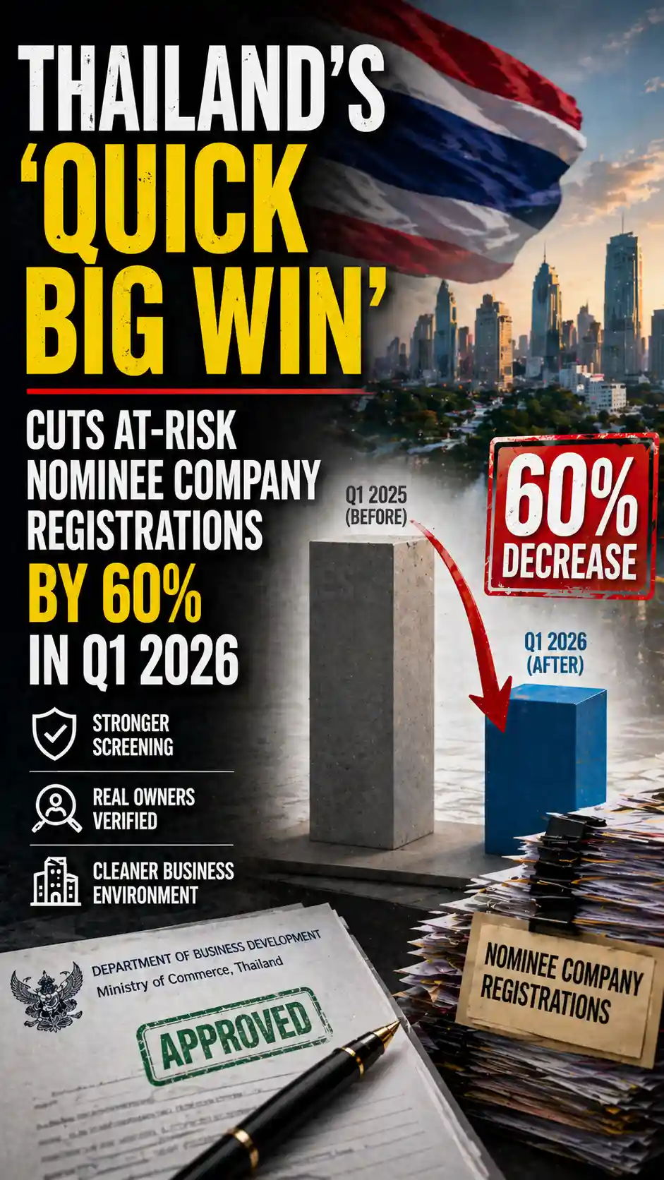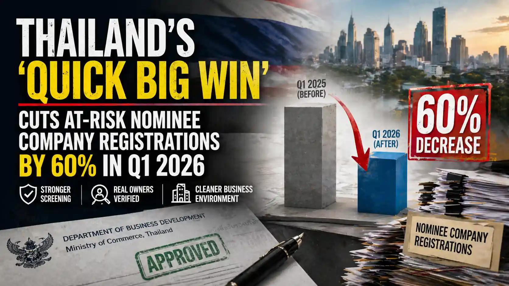 Thailand's Quick Big Win policy cut at-risk nominee company registrations 60% in Q1 2026, with tightened laws, expanded probes and inter-agency data sharing.